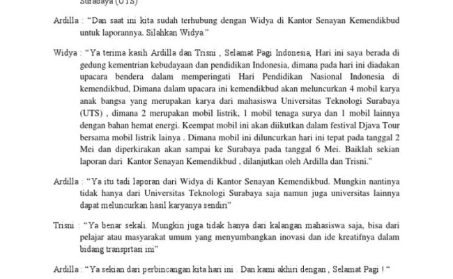 Selamat pagi dan selamat datang di breaking news. Saya jordy lee dan saya akan memandu kamu selama 5 menit ke depan. You watched headline news on monday, 22nd december, 2016 at 08:00 am with me, amelia linton. Numerous earthquakes are still following until today, destroying more and more villages. Dengan membaca berita kita bias . Contoh teks presenter berita dalam bahasa. Selamat pagi dan selamat datang di breaking news. Di dalam teks berita bahasa inggris kamu bukan hanya membaca inti berita tetapi juga pembukaan dan perkenalan nama. Contoh naskah berita dalam bahasa inggris beserta artinya . Nama saya nama dan saya adalah pembawa acara hari ini let me introduce myself first. We are going to see how the current condition is after the latest . Contoh teks reporter berita dalam bahasa inggris beserta tejermahannya. Hallo english learners!kali ini miss eva, akan menjadi presenter berita lho!, dan yang bikin seru, miss eva membawakannya dalam bahasa . Headline news this time will preach news of traffic . Teks pembawa acara dalam bahasa inggris mc.
